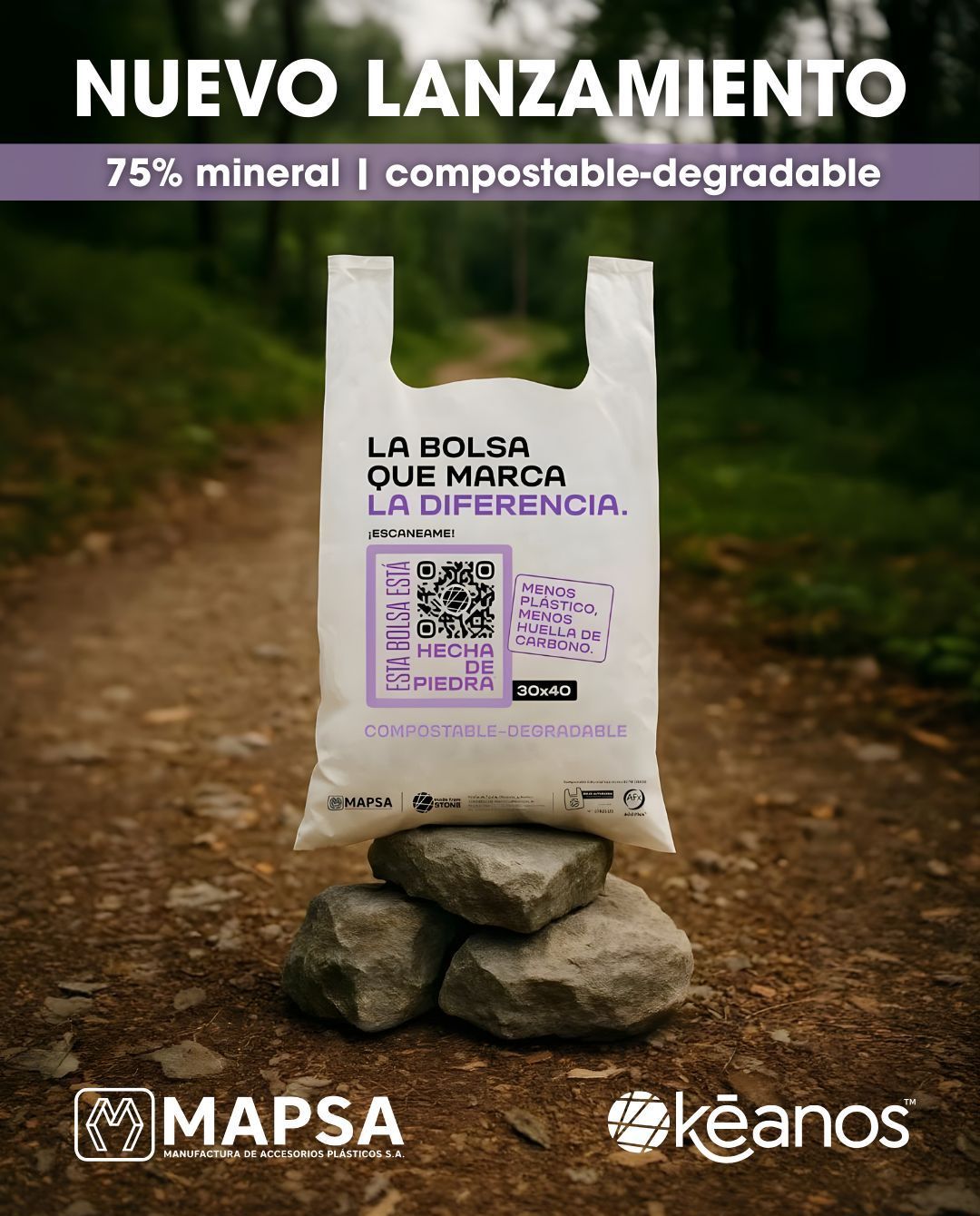 MAPSA presenta una nueva bolsa camiseta desarrollada con tecnología mineral Okeanos®️, donde la piedra reemplaza gran parte del Polietileno, reduciendo la huella de carbono sin afectar el desempeño del producto, por el contrario mejorándolo.🙌🏼